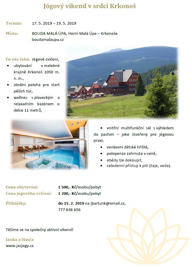 - [17. - 19. 5. 2019] Víkendový jógový pobyt v Malé Úpě